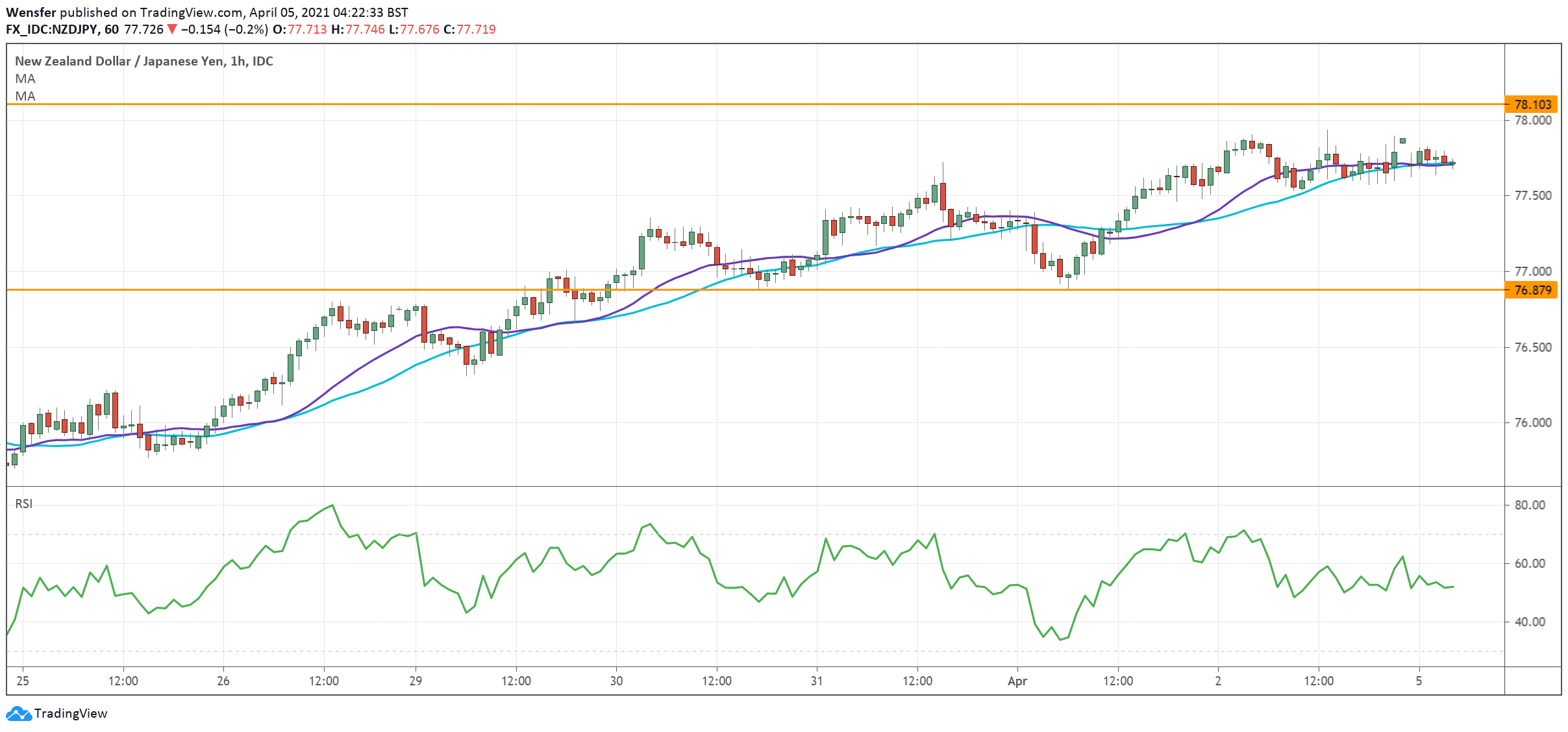 A bullish breakout with convincing momentum could resume the uptrend. If not, a drop below 76.90 may force a trip back to 76.00.
