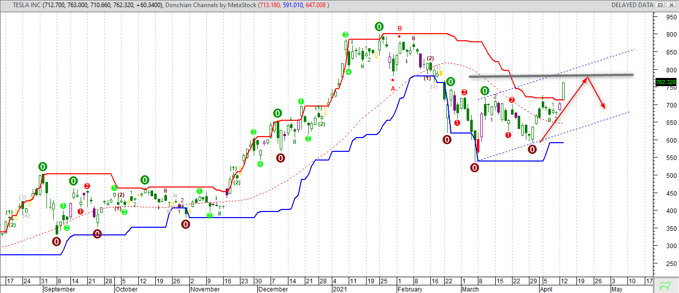 Tesla dopo aver segnato dei minimi relativi in area 550, a correzione della precedente fase rialzista costantemente ridefinita in termini parabolici, ha intrapreso una dinamica di correzione al rialzo che non apporta ancora modifiche sostanziali alla situazione generale, poiché l’impressione che si ricava dalle implicazioni tecniche assunte è quella di reazione tecnica finalizzata alla ricerca di un massimo “tecnico” dal quale tornare a scendere. Detto questo, è lecito attendersi la continuazione di questa articolata fase reattiva tesa a validare la prima resistenza su quota 780, che potrebbe ostacolare nuove rivalutazioni. Tutti i riferimenti tecnici e spazio-puntuali avvalorano uno status tecnico neutro-ribassista con espressioni correttive intermedie tese a garantire il ricambio delle correnti operative, con il controllo dei supporti visti a quota 660. Una rottura di questo supporto, invece, sarebbe negativo e presupporrebbe un DOWNSIDE verso quota 530 prima e 450, a conferma della suddetta ipotesi ribassista.