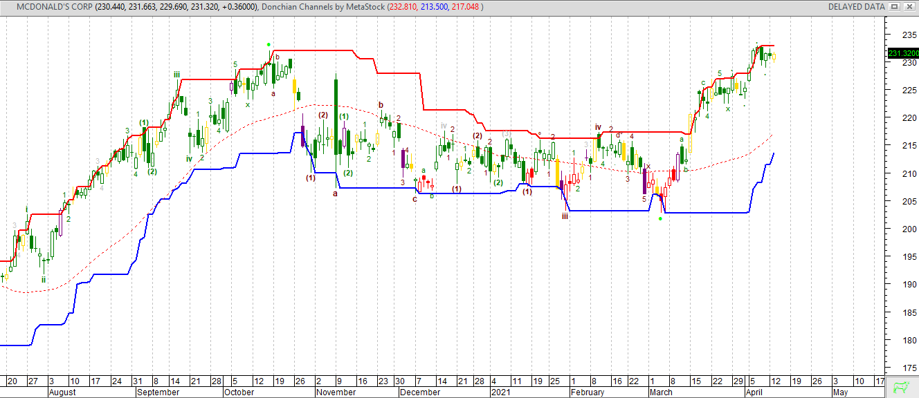 Situazione sostanzialmente positiva per il titolo McDonald’s, le cui quotazioni sono uscite al rialzo sopra quota 220, livello di resistenza desunto dal box originato lo scorso 26 ottobre. L’effettiva motivazione di questa ritrovata fase rialzista andrebbe ricondotta al concetto di GRANDE ROTAZIONE con uscita dei grossi investitori dal comparto tecnologico verso titoli della OLD ECONOMY. Per le implicazioni tecniche assunte da McDonald’s, l’operatività più coerente, dopo il segnale LONG scaturito sopra quota 220, sarebbe quella di alleggerire le posizioni a ridosso dei massimi dello scorso ottobre in area 232/235, tralasciando al momento, posizionamenti di ampio respiro, poiché si ritiene imminente una fase correttiva.