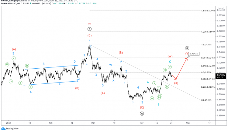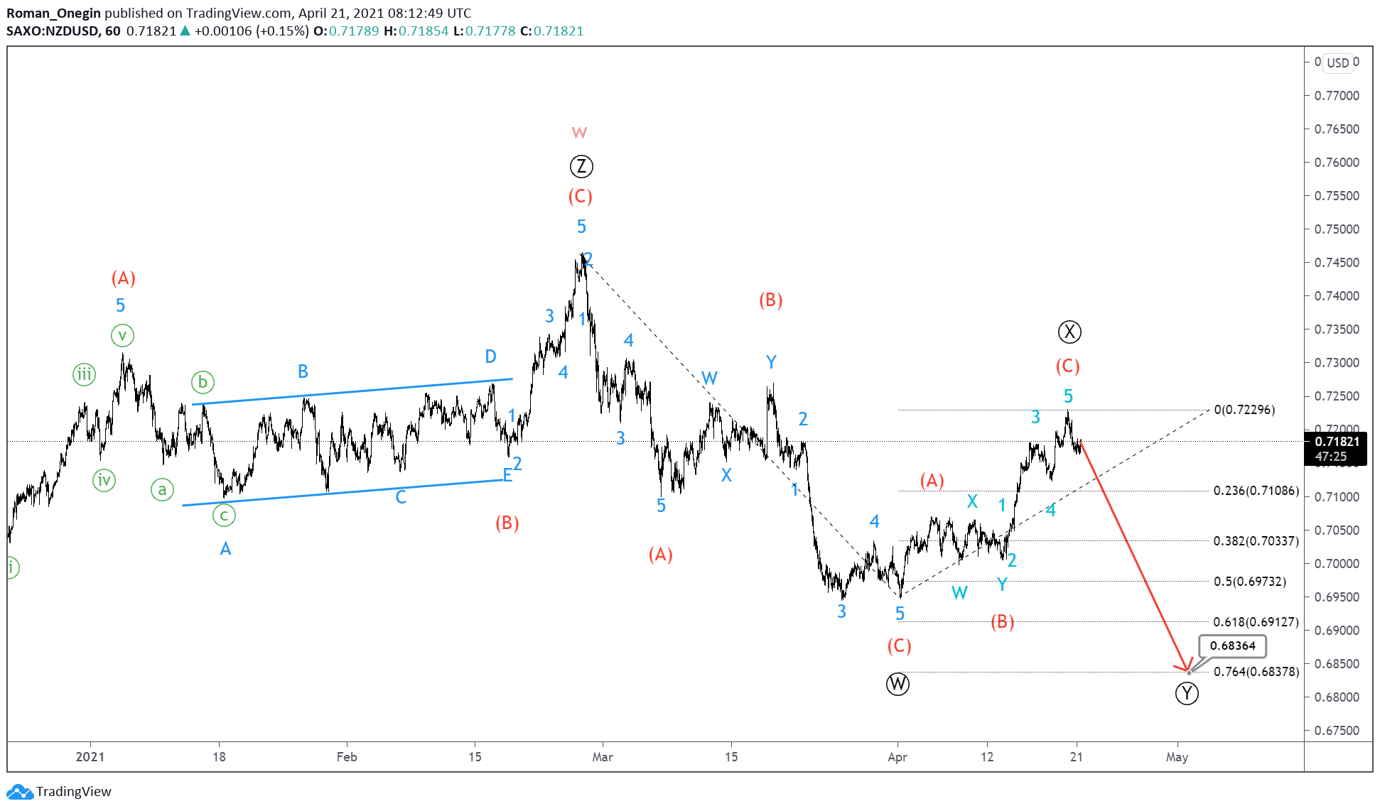 In the short term, the price is likely to decline slightly in the intermediate intervening wave (X). Then the price could rise in the final wave (Y) to the area of the price level of 0.734.