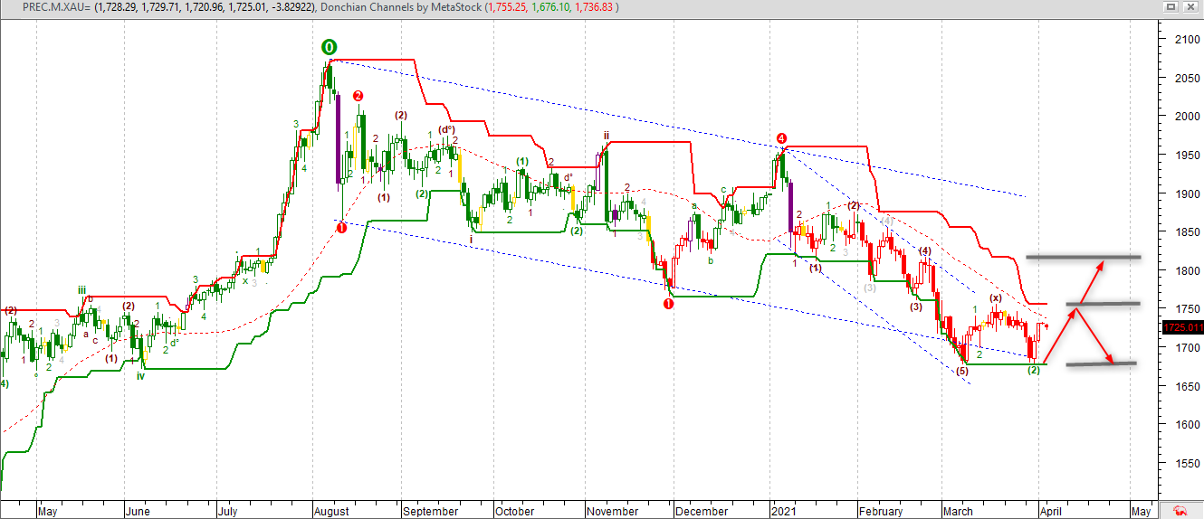 Su proiezioni di breve termine il GOLD dopo aver violato il supporto a quota 1,700 USD e testato in velocità quota 1,680, ha reagito in forza dell’ipervenduto riportandosi in area 1,730 e puntando quota. Nel complesso, il modello configurato dai massimi dello scorso agosto è quello di un grosso canale ribassista, moderatamente inclinato, che sta accompagnando l’intero processo negativo, in configurazione impulsiva e con chiusura onda 5 a ridosso della base inferiore del suddetto canale. Quota 1,700, ovviamente, è una cifra rotonda ed è prevedibile che le quotazioni possano girare in questo intorno per qualche tempo. Se il GOLD dovesse attaccare e rompere quota 1,750, il segnale che entrerebbe, supporterebbe il rialzo fino a 1,820. Al ribasso invece, la ricompressione a ridosso di 1,680 porrebbe nel radar quota 1,650, ultimo baluardo prima di un sell-off verso quota 1,500.
