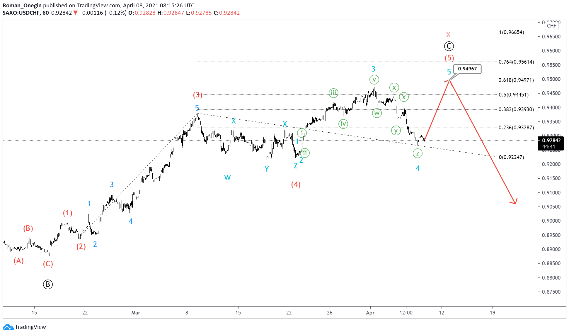 The USDCHF formation on the 1H timeframe hints at a standard zigzag pattern consisting of primary waves Ⓐ-Ⓑ-Ⓒ. This completed a large intervening wave x of a cycle degree.