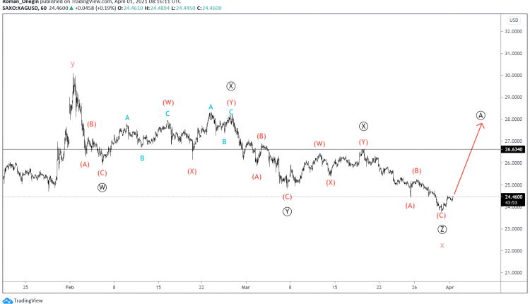 In the medium term, we could expect the development of the primary impulse wave Ⓐ. XAGUSD may rise in price above the previous high of 26.63, where the primary wave Ⓧ ended.