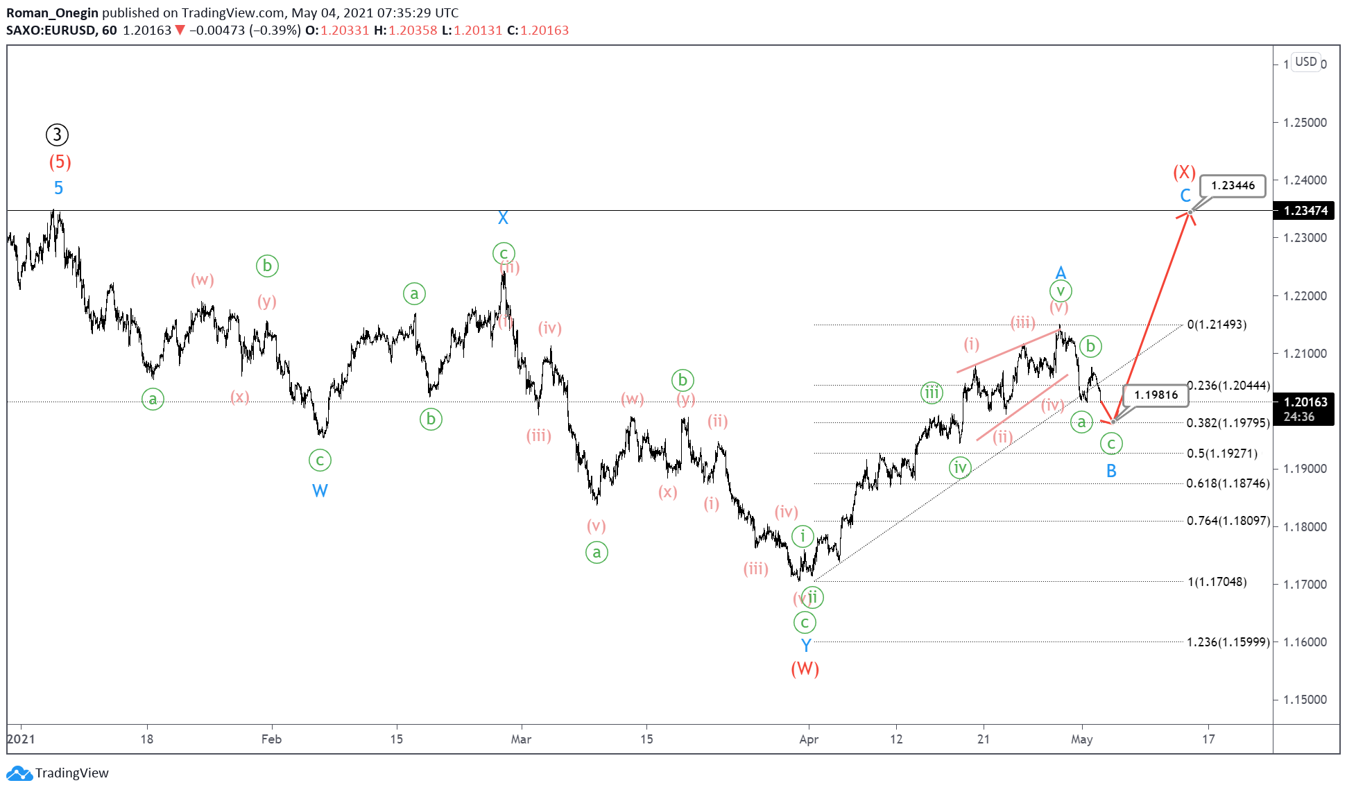The minor impulse A is already completed, soon we can see the end of the formation of the bearish correction B- near the level of 1.198. At that level, wave B will be at 38.2% of wave A.