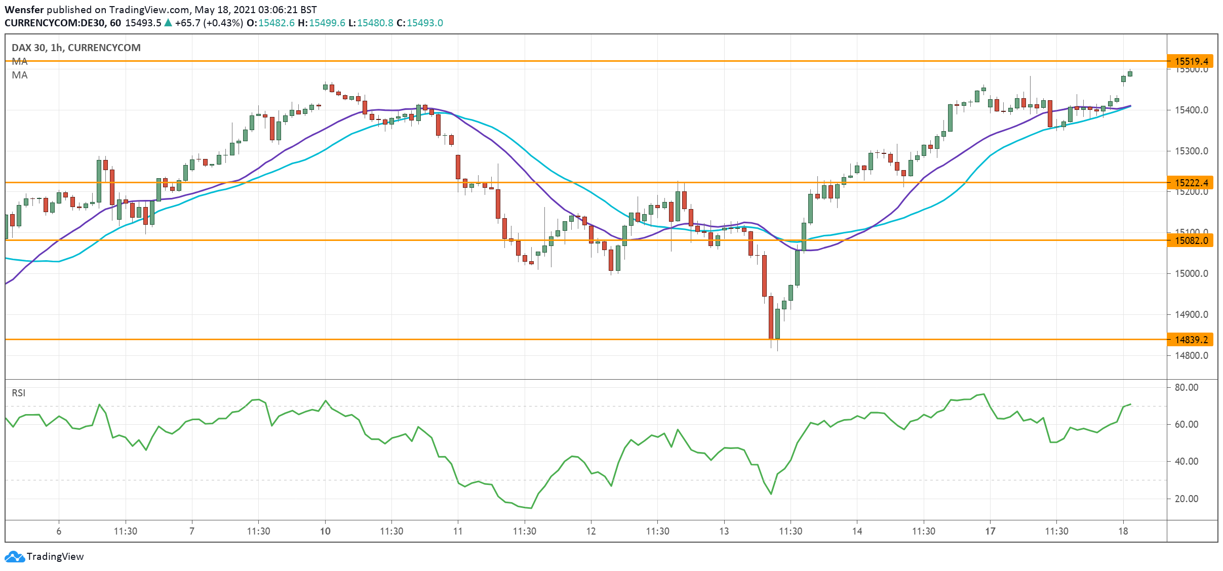 April’s high at 15520 is the main obstacle and a breakout could push the index to a new record high. 15220 is the closest support in case of a pullback.