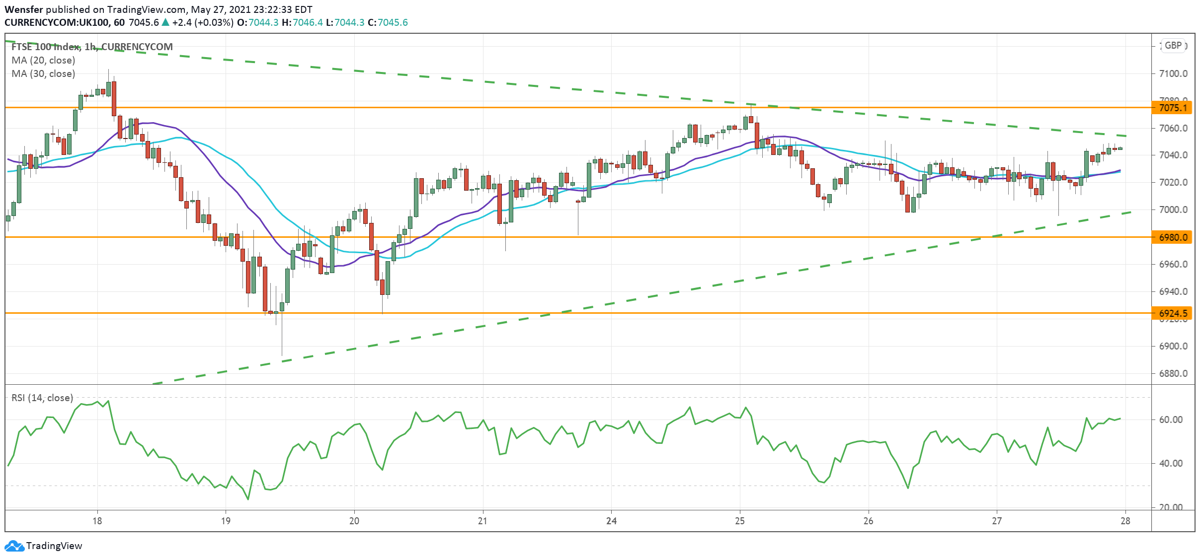 The index is trading in a narrowing range between 6980 and 7075. This is a sign of the market’s indecision intraday. A break above the pennant would boost momentum and lead the price to 7160, eventually turning into a bullish continuation.