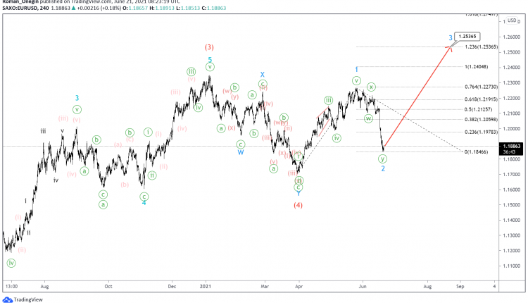 The bearish correction wave (4) seems to have just been completed, as it has taken the form of a double zigzag W-X-Y.
