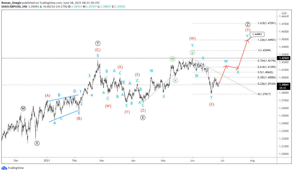 The formation of GBPUSD hints at the development of a corrective trend. Most likely, a triple zigzag is currently under construction. This consists of sub-waves Ⓦ-Ⓧ-Ⓨ-Ⓧ-Ⓩ of the primary degree.