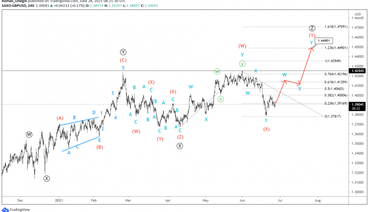 In the near future, market participants could see the end of the intermediate zigzag wave (X). Then the price will continue to fall in the last wave (Y) to 1.3449. At that level, wave Ⓧ will be at 76.4% of wave Ⓨ.