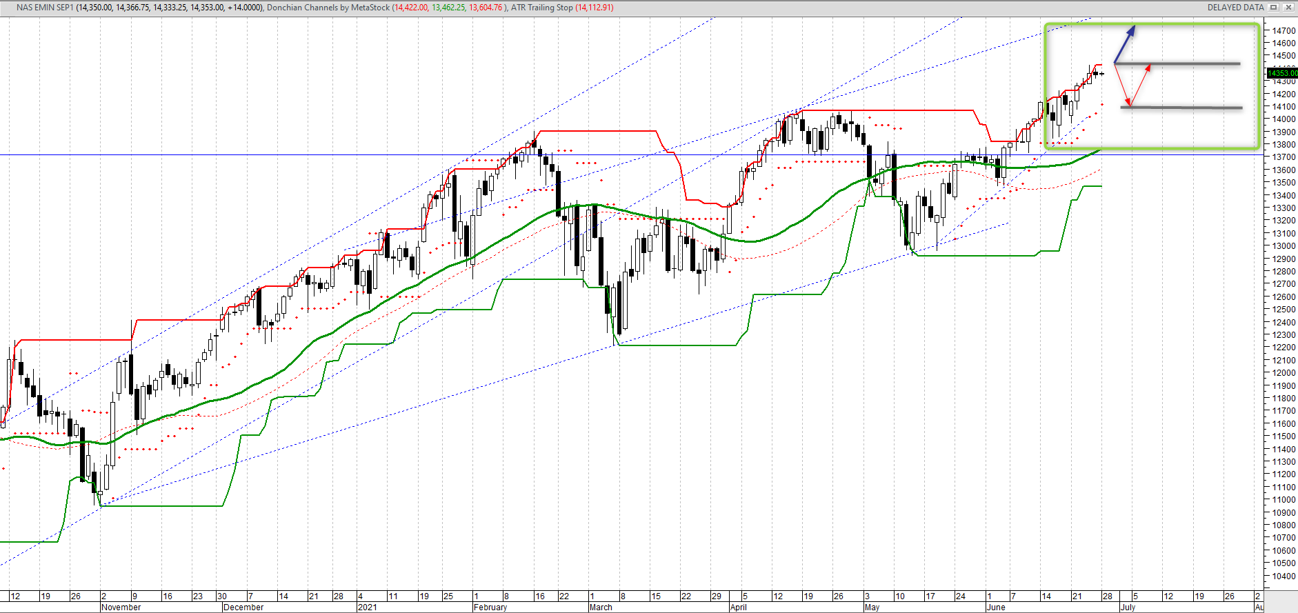 I futures sull’indice NASDAQ-100 di settembre confermano il raggiungimento del record storico validato nella sessione precedente, poiché gli investitori evidentemente continuano a minimizzare l’impatto dell’aumento dell’inflazione e quindi la conseguente pressione sui tassi che possa impattare negativamente sugli utili futuri. I guadagni di Nvidia Corp e Facebook Inc, unitamente al rally di Tesla, hanno riattivato il rimbalzo dei titoli GROWTH, precedentemente caduti in disgrazia a favore dei titoli VALUE in raccordo al miglioramento dell’economia. Strutturalmente il Trend dominante è al rialzo con livello confermativo segnalato a quota a 14,358.75 per target a 14,432. Sotto quota 13,451 invece la tendenza principale invertirà al ribasso, tecnicamente improbabile, ma eventualmente proponibile a causa del prolungato rialzo in termini di prezzo e tempo con implicazioni per un’inversione del prezzo di chiusura potenzialmente ribassista.