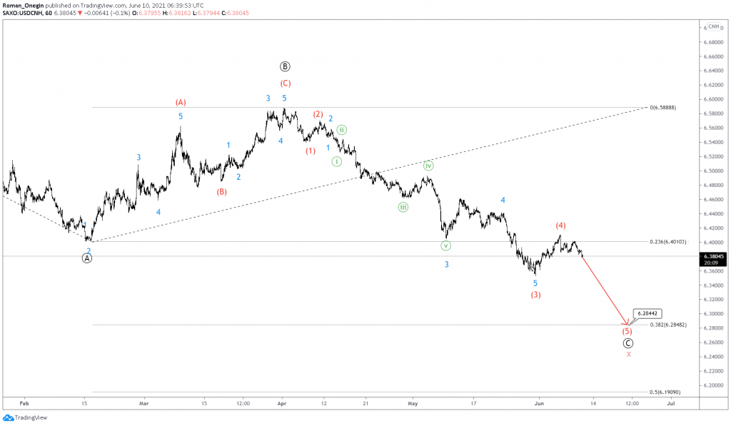 The current USDCNH structure indicates the formation of a large bearish zigzag x of a cycle degree. This consists of primary sub-waves Ⓐ-Ⓑ-Ⓒ. The sub-waves Ⓐ and Ⓑ have ended.