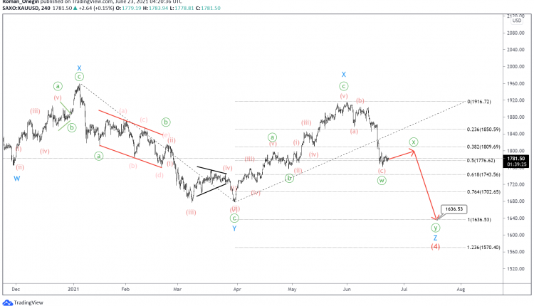 The correction wave (4) has a complex formation of a triple zigzag which includes minor sub-waves W-X-Y-X-Z. Four of the five parts of this pattern look fully completed, and the last fifth sub-wave Z is still under development.