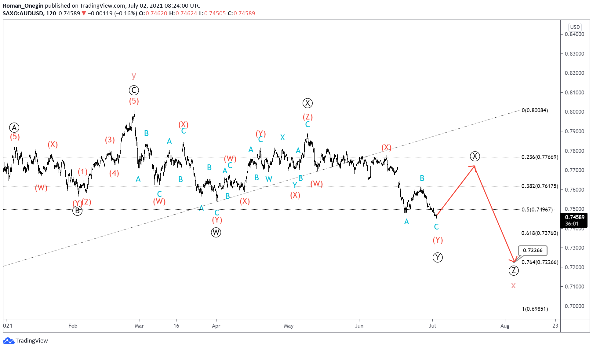The current AUDUSD structure hints at the construction of a large corrective trend. This takes the form of a triple combination consisting of cycle sub-waves w-x-y-x-z.