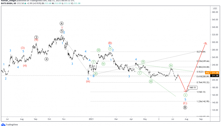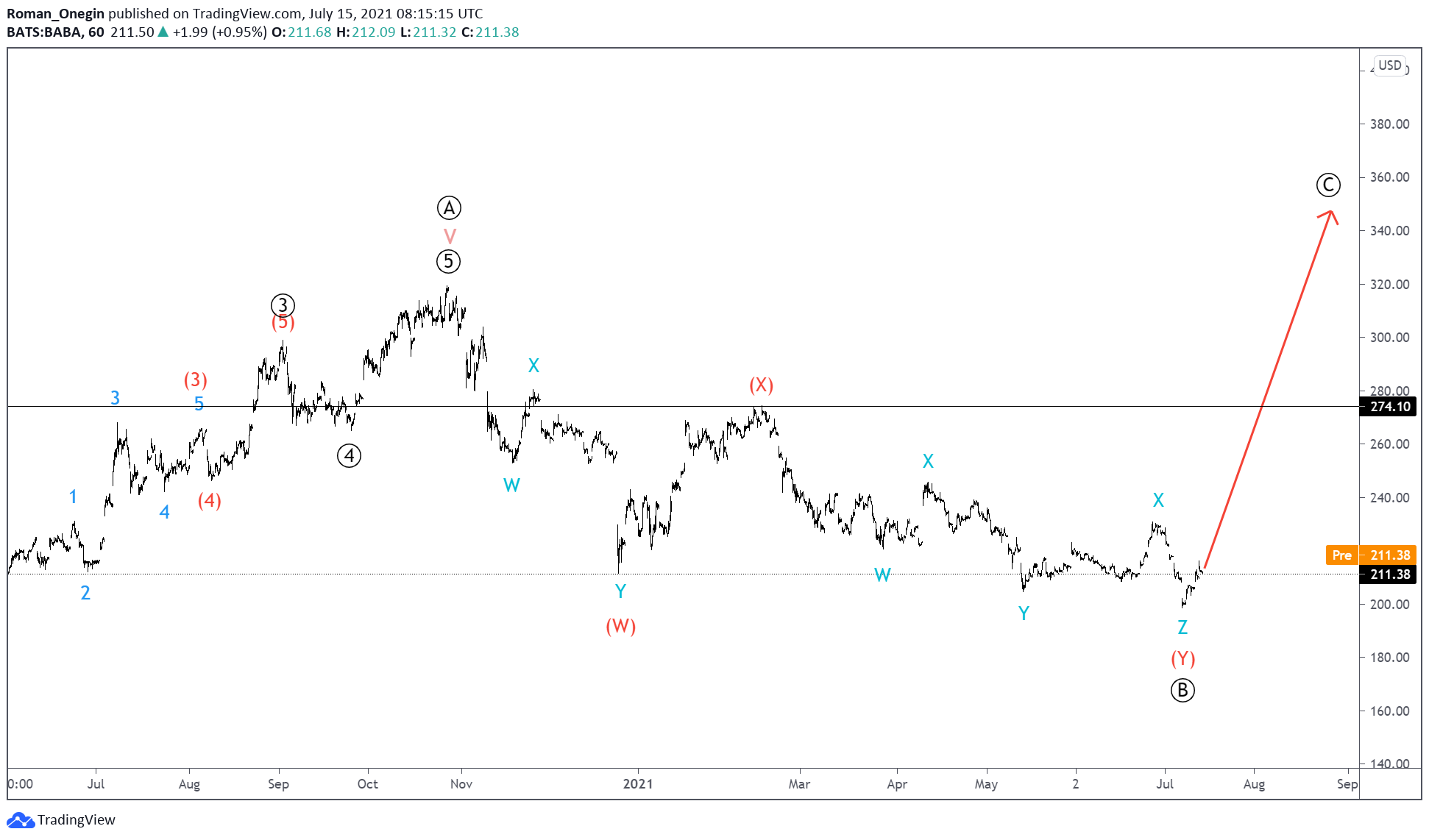 On the 1H timeframe of the BABA stock chart, we see the structure of a large Ⓐ-Ⓑ-Ⓒ zigzag.