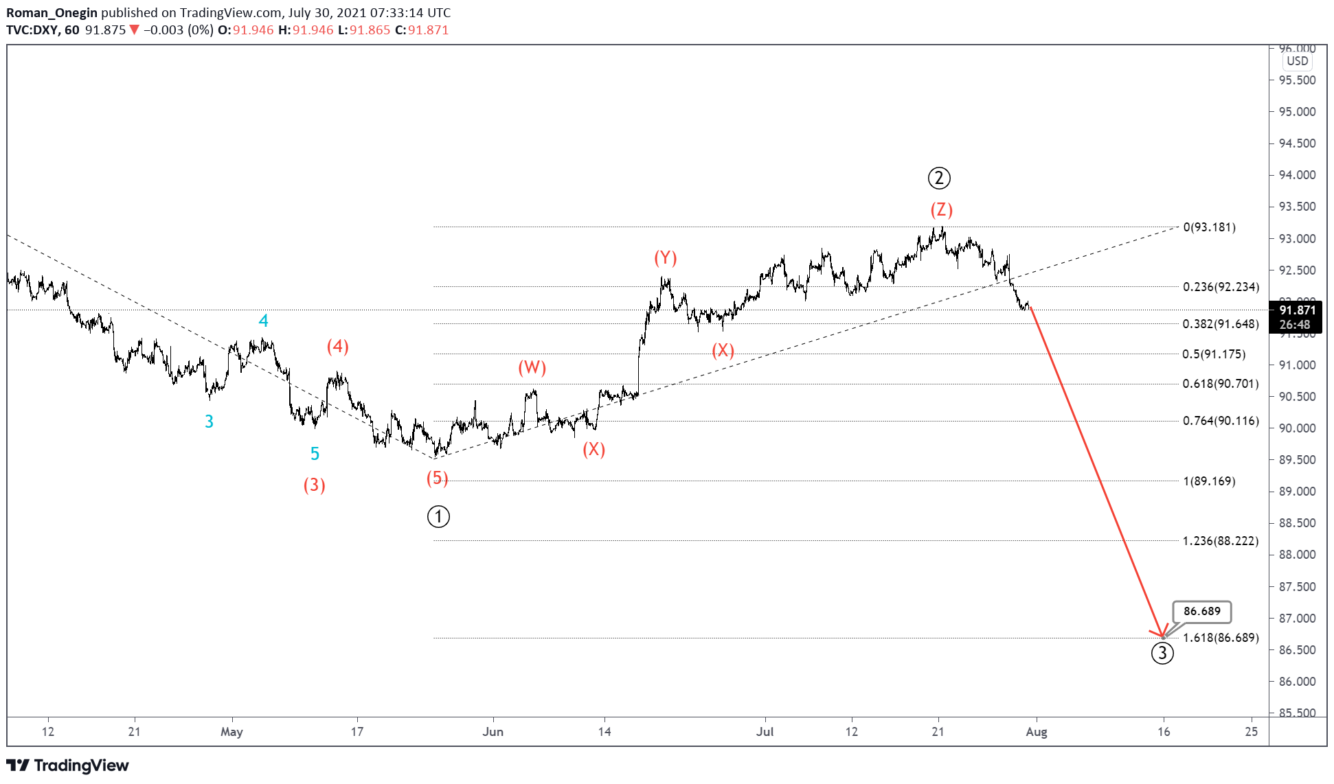 The current structure of the DXY index suggests that we are in a correction wave IV of a cycle degree. Its formation is similar to a large triple Ⓦ-Ⓧ-Ⓨ-Ⓧ-Ⓩ zigzag.