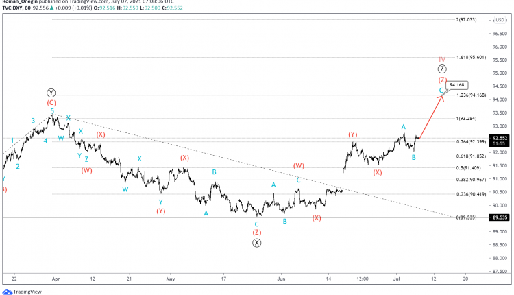 The current structure of the DXY suggests that we are in a correction wave IV of a cycle degree. Its formation is similar to a large triple Ⓦ-Ⓧ-Ⓨ-Ⓧ-Ⓩ zigzag.