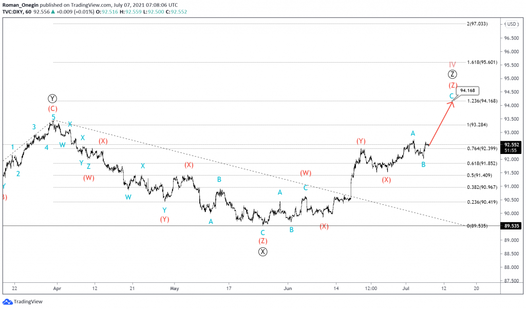 The current structure of the DXY suggests that we are in a correction wave IV of a cycle degree. Its formation is similar to a large triple Ⓦ-Ⓧ-Ⓨ-Ⓧ-Ⓩ zigzag.