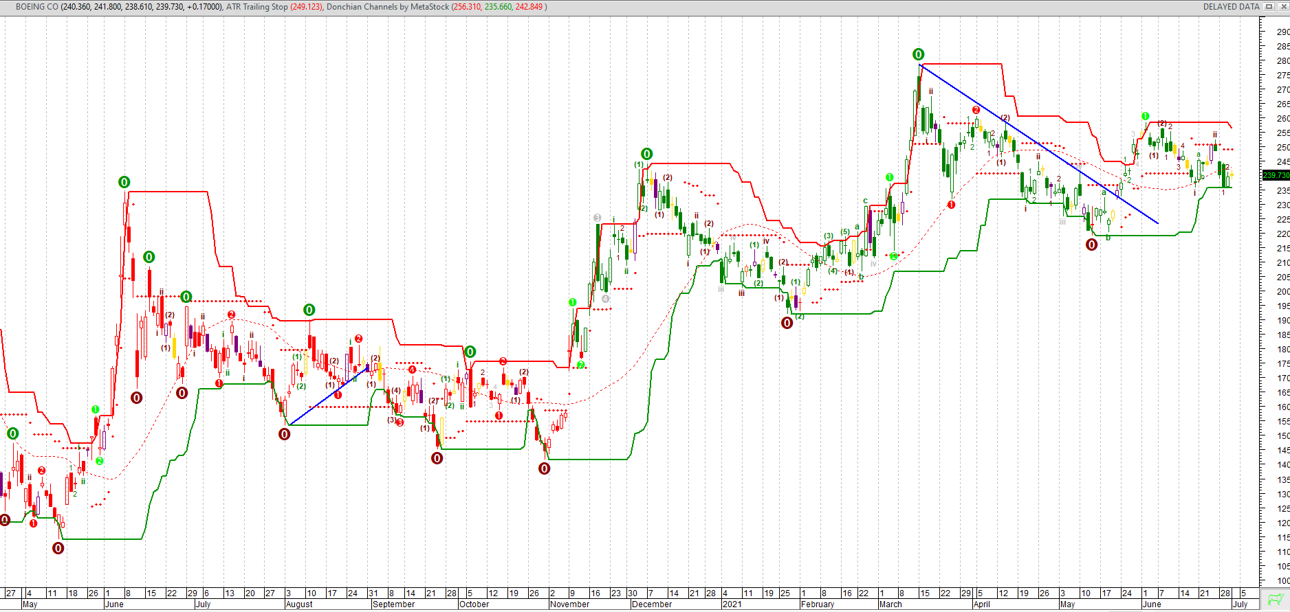 FCF Stock Checkup evidenzia che le azioni BOEING hanno una classificazione FCF Composite di 49. La valutazione indica che le azioni BOEING attualmente superano il’49% di tutte le azioni configurate su basi fondamentali e tecniche di selezione dei titoli più importanti. La sua valutazione di forza relativa risulta invece debole con un check a 58. Questo tipo di valutazione perimetra la leadership del mercato mostrando come il movimento del prezzo di un titolo nelle ultime 52 settimane si relaziona a quello di altri titoli. BOEING ha attualmente un rating di processo accumulazione/distribuzione positivo, includendo forti acquisti istituzionali. Tecnicamente la fase di forza rialzista è al momento sospesa per l’entrata del titolo in correzione tecnica e questo movimento di flessione tecnica potrebbe continuare anche sotto i supporti a 235 per validare il target a 225.