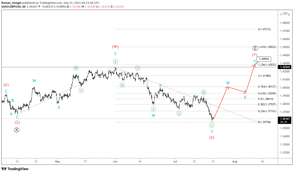 GBPUSD is forming a triple zigzag consisting of primary sub-waves Ⓦ-Ⓧ-Ⓨ-Ⓧ-Ⓩ. We are now in the final leg of the specified construction, in the sub-wave Ⓩ. It’s likely that it takes the form of a double (W)-(X)-(Y) zigzag of the intermediate degree.