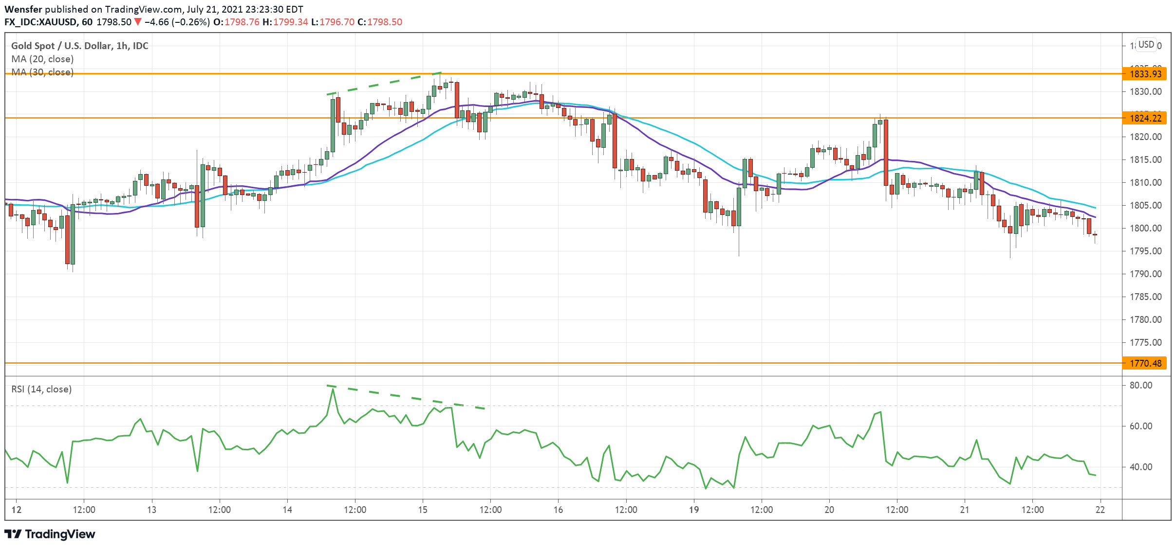 The recovery has met stiff selling pressure near 1830, a supply zone from last June’s sell-off. The RSI divergence was a sign that the rally was losing steam. The subsequent break below 1805 came in as a confirmation that the bears were still around.