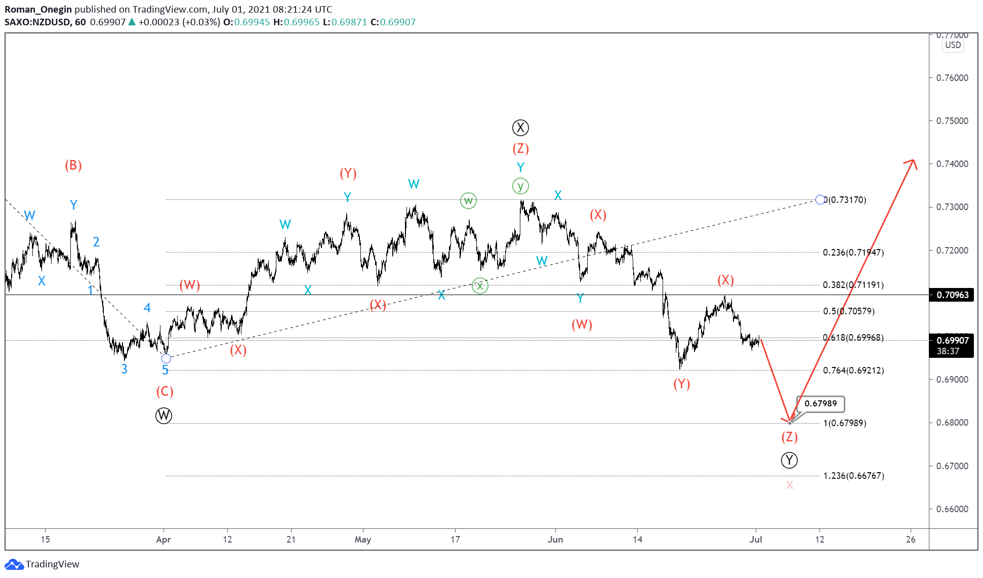 Then the bulls can start leading the market above the maximum of 0.709 formed by the intervening wave (X).