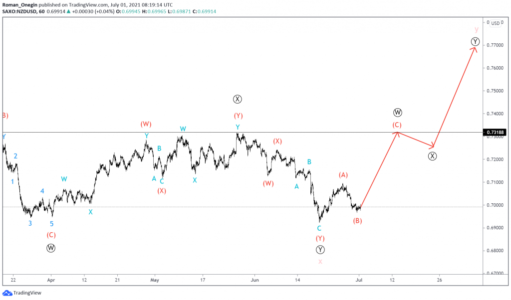The NZDUSD formation hints at the completion of a large intervening wave x of a cycle degree. Most likely, it has fully completed its pattern, taking the form of a primary double zigzag.