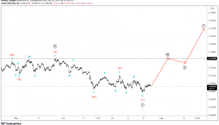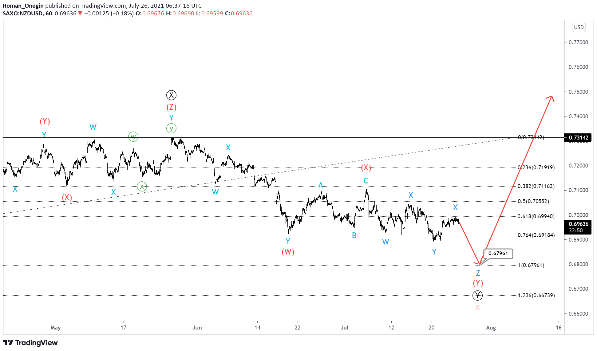 The current structure of the NZDUSD pair hints at the completion of an intervening wave x of the cycle degree. The pattern has taken the form of a primary double zigzag.