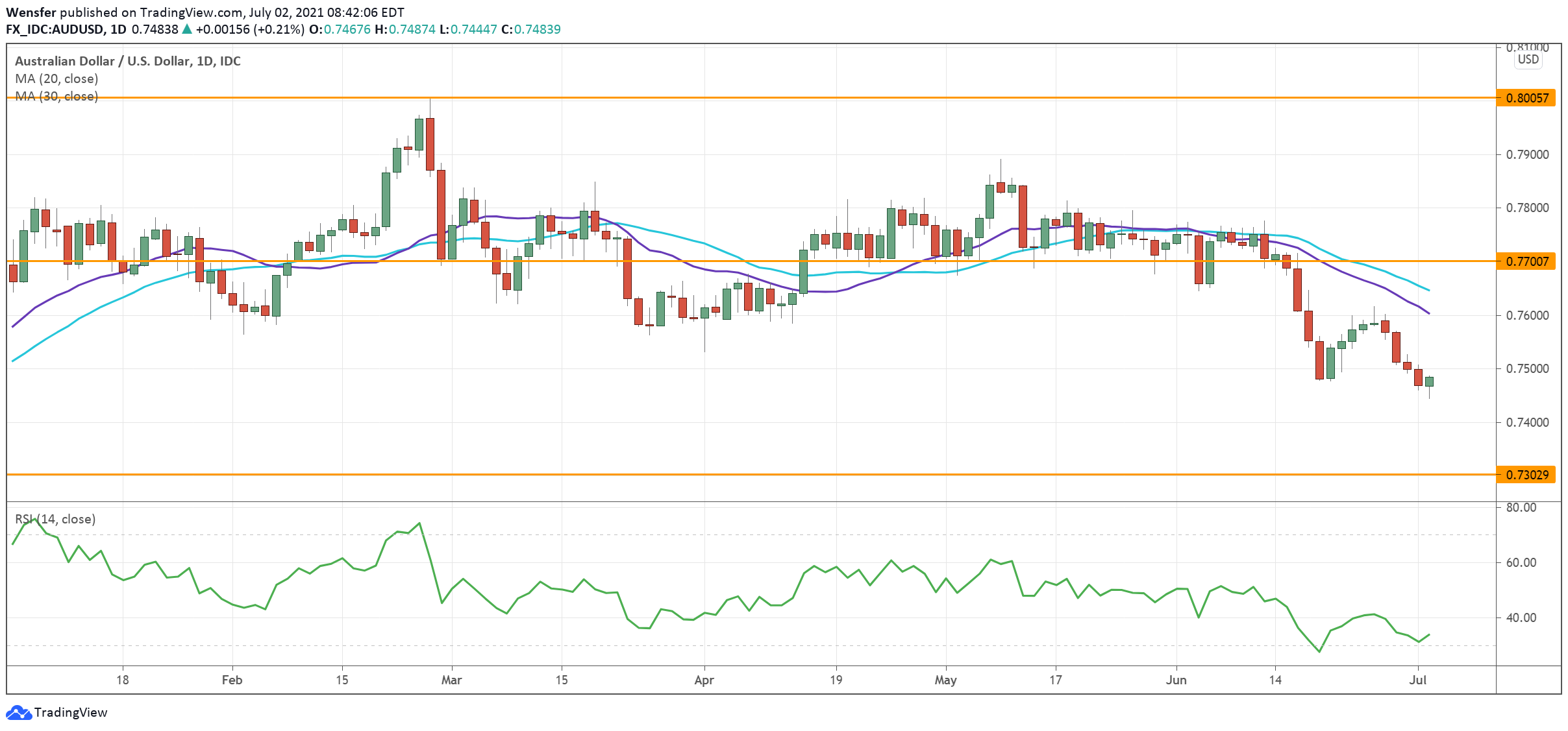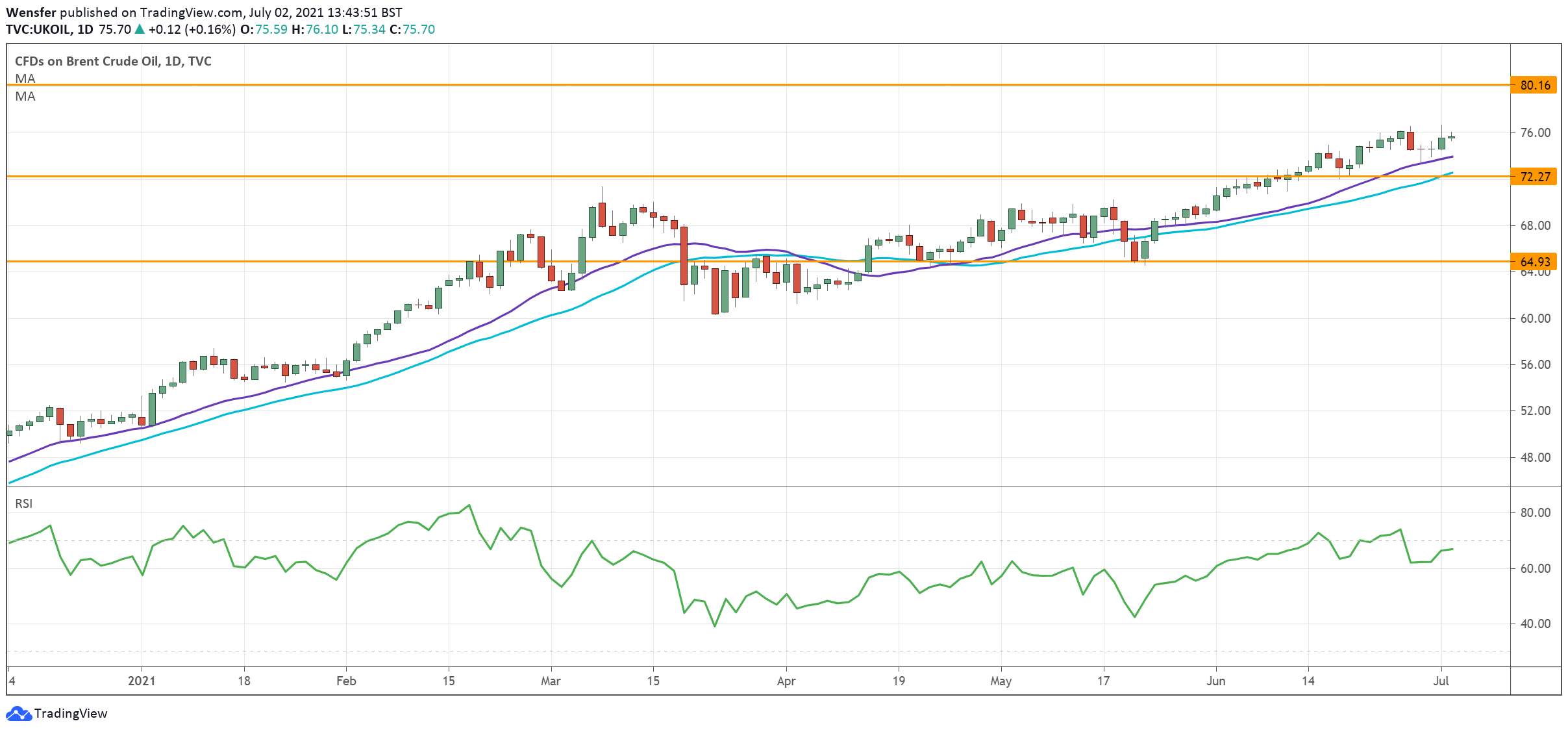 The bulls are aiming at the psychological level of 80.00. 72.30 along the 30-day moving average is the closest support.