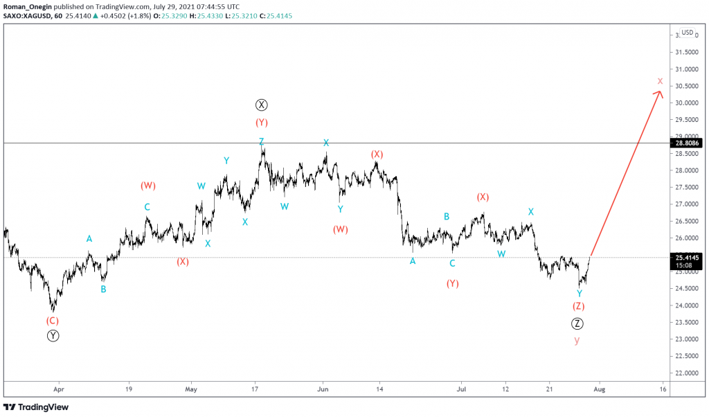 In the near future, the market could rise, then the intervening wave x of a cycle degree will begin. The price in this wave can update the previous maximum at the level of 28.80.