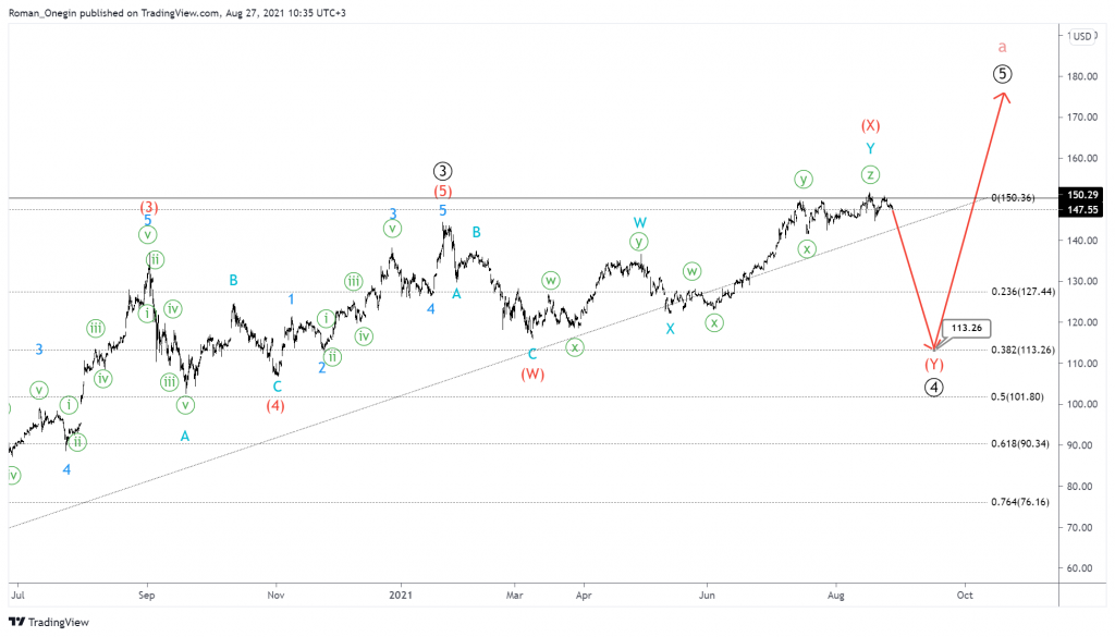 After that, the market may turn around and start moving up in the final wave ⑤ significantly above 150.29, which the intervening wave (X) marked.