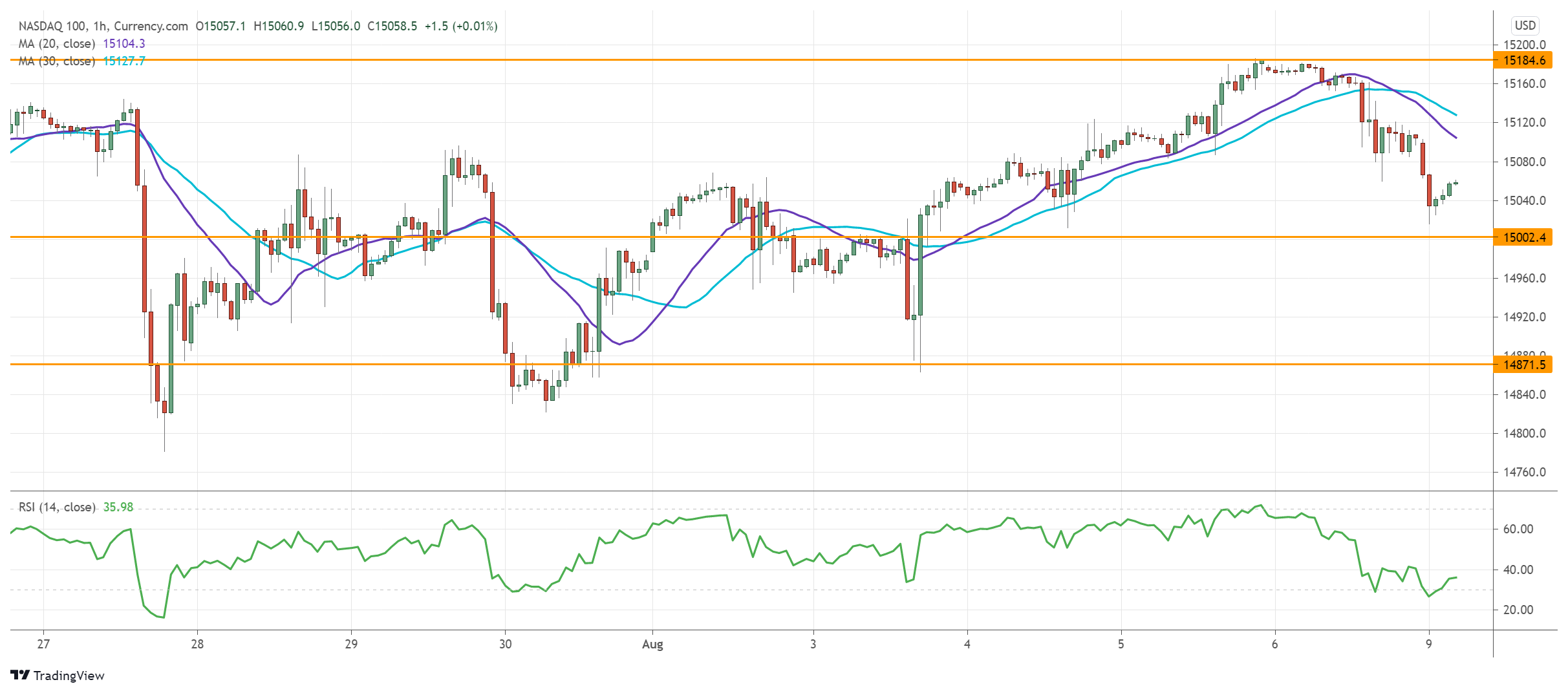 Buying interest could be found in the demand area between the 30-day moving average (14870) and the psychological level of 15000. A bullish breakout may stir up momentum and send the index to 15300.