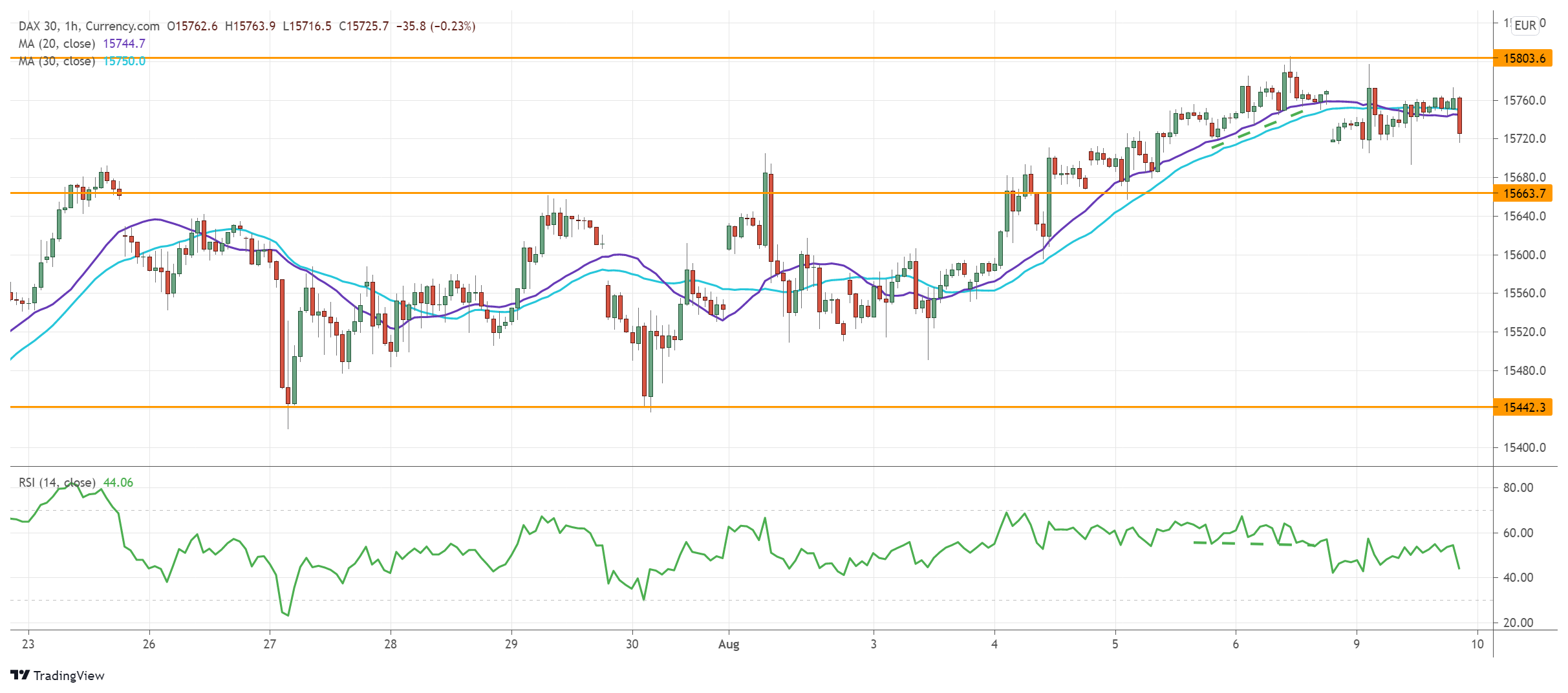 The Dax 30 hits a speed bump as investors fret about tapering in the wake of strong US jobs data. The rebound has come to a halt right at the peak at 15800.