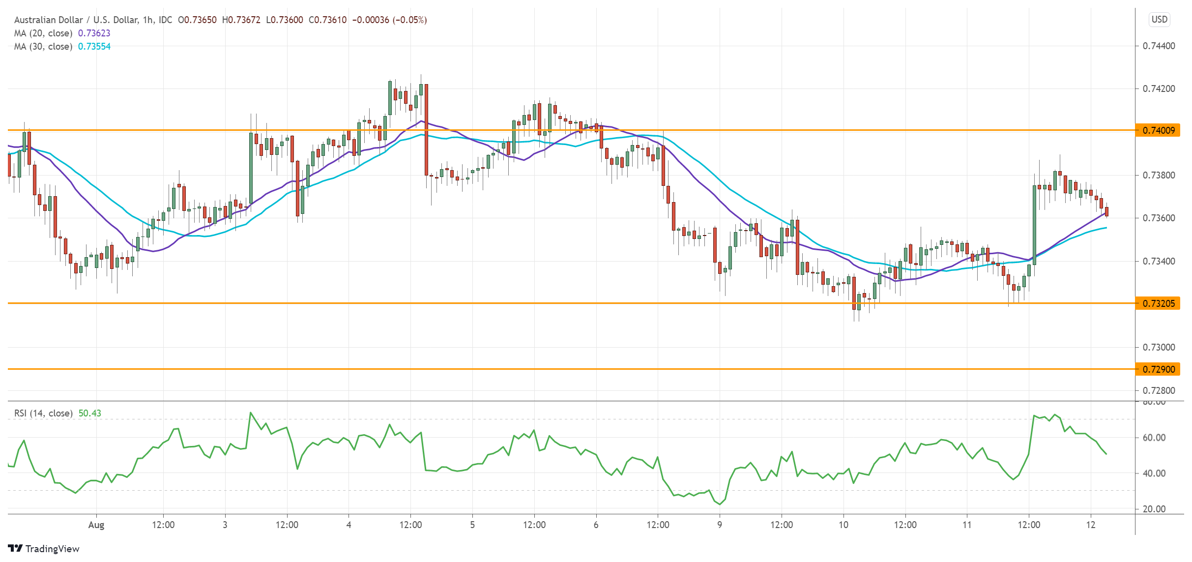 The pair is still under pressure after it met stiff selling pressure at the 20-day moving average (0.7400).
