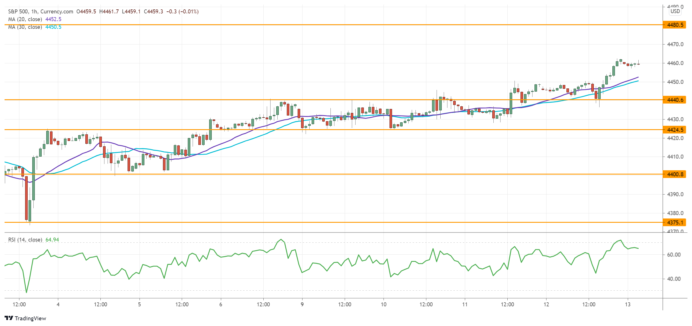 A series of higher highs suggests that the bullish sentiment is still intact. 4480 would be the next stop as momentum traders jump in. The RSI has broken into the overbought territory, which could temper buyers’ fever to raise their stakes.