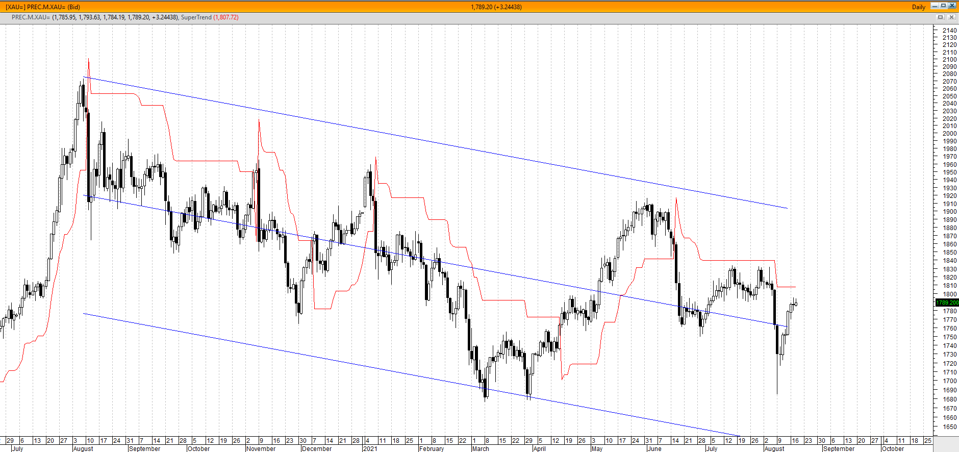 Per proiezioni di breve termine, dopo lo “short squeeze” di settimana scorsa, il GOLD è approdato sull’importante resistenza in area 1,800, aiutato dal ritiro della mano ribassista che ne aveva provocato lo scivolamento fino a quota 1,680. In sintesi, il trend di breve dell’ORO, in raccordo a quello di lungo, ha trovato giustificazione nelle tensioni assunte sul fronte dei tassi a breve in aumento, forzando il dollaro al rialzo per compensare le tensioni che stavano impattando sui Bond USA. Quota 1,800, ovviamente, è una cifra rotonda e psicologicamente significativa, ma la vera resistenza tecnica incrocia attualmente a quota 1,835. Se il GOLD dovesse attaccarla e romperla, il segnale che entrerebbe, rafforzerebbe la situazione tecnica definendo il target in upside a quota 1,875, ma per le implicazioni tecniche assunte e per logica intermarket questa possibilità sembra piuttosto remota.