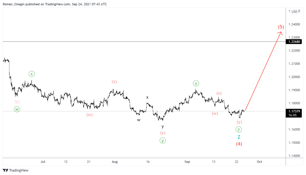 The EURUSD currency pair seems to be forming a large bullish impulse. This impulse consists of intermediate sub-waves (1)-(2)-(3)-(4)-(5). The construction of the intermediate correction wave (4), which takes a complex structure, has ended.