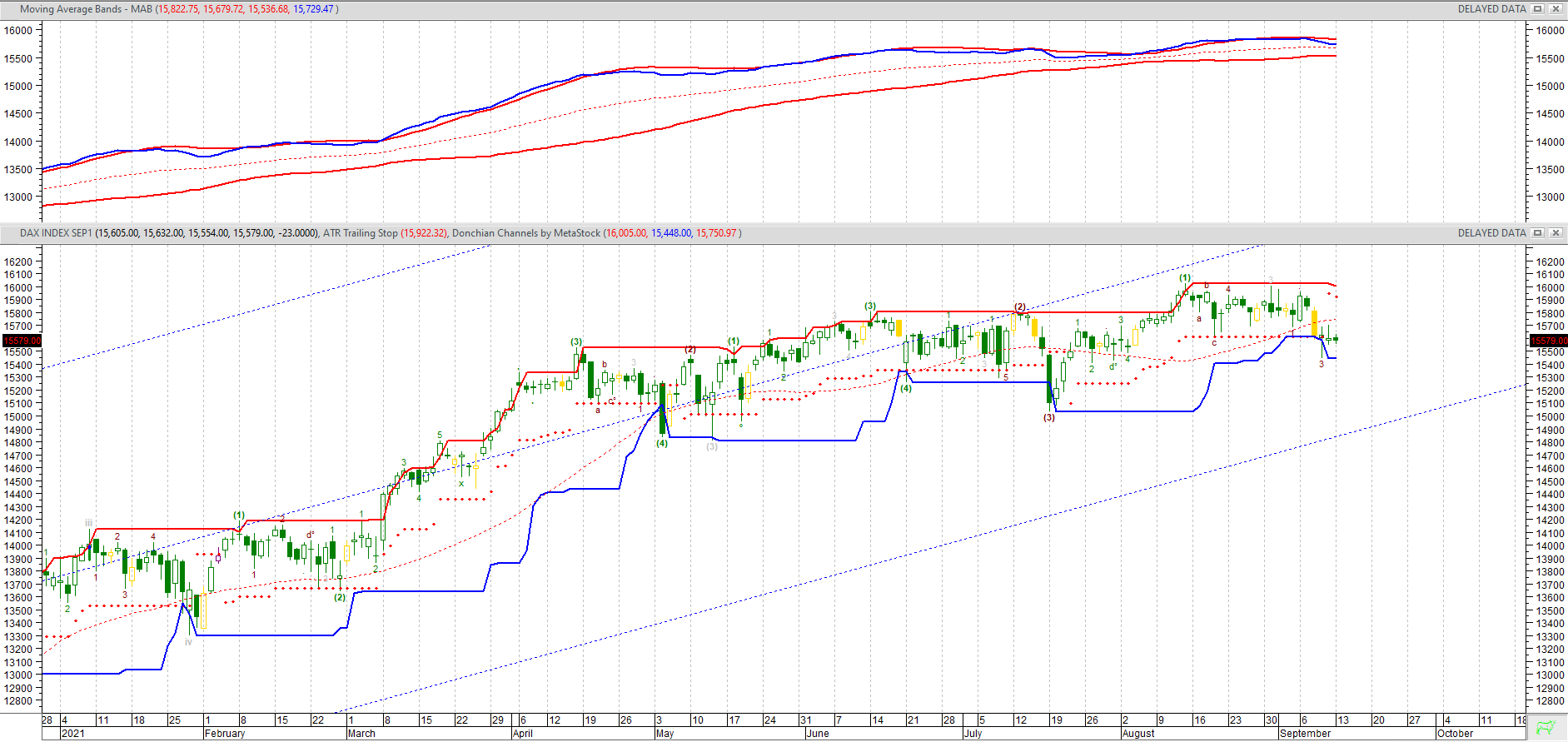 Chiusura di settimana in controllato ribasso per il DAX future, che non riesce a sopravanzare i massimi assoluti segnati lo scorso 13 agosto a 16,024. Nessuna modifica quindi per l’impalcatura tecnica, con i sistemi ben allineati sul lato lungo del mercato. I supporti di contenimento scendono sensibilmente posizionandosi a 15,475, ma già la rottura di quota 15,675 ha pregiudicato la qualità del trend di breve, con attese ribassiste. Sotto quota 15,475 sarebbero concrete le possibilità di approdo in area 15,240, intercettata da più variabili di tipo spazio-puntuale. L’autoreferenza del movimento rialzista, peraltro parzialmente evaporata, induce a seguire le prossime evoluzioni focalizzando l’attenzione in chiave ribassista, vista la contrazione della volatilità delle medie mobili di riferimento a breve e medio periodo, come si evince dall’indicatore posto sul grafico.