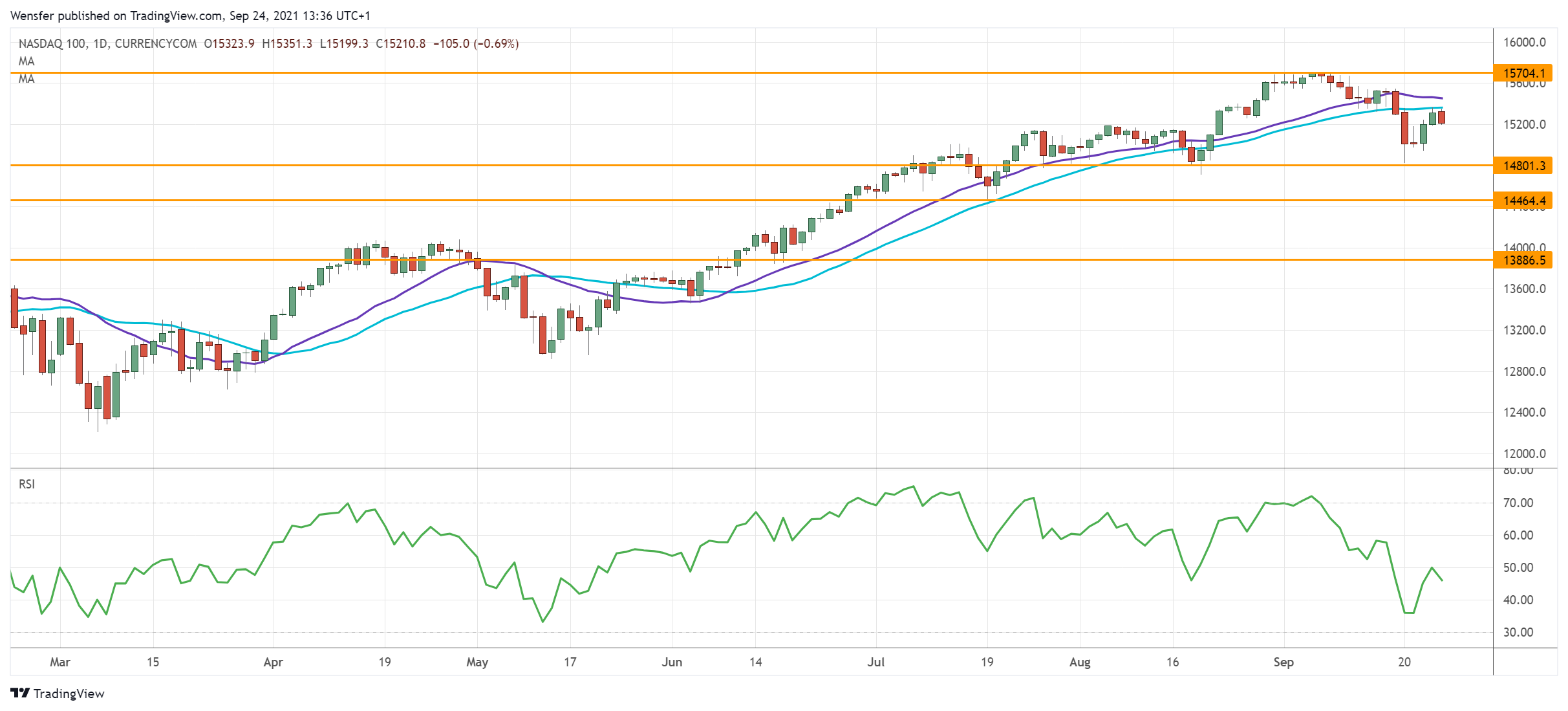 The tech index has found bargain hunters on the first support line at 14800. A rally above 15700 would open the door to 16000.