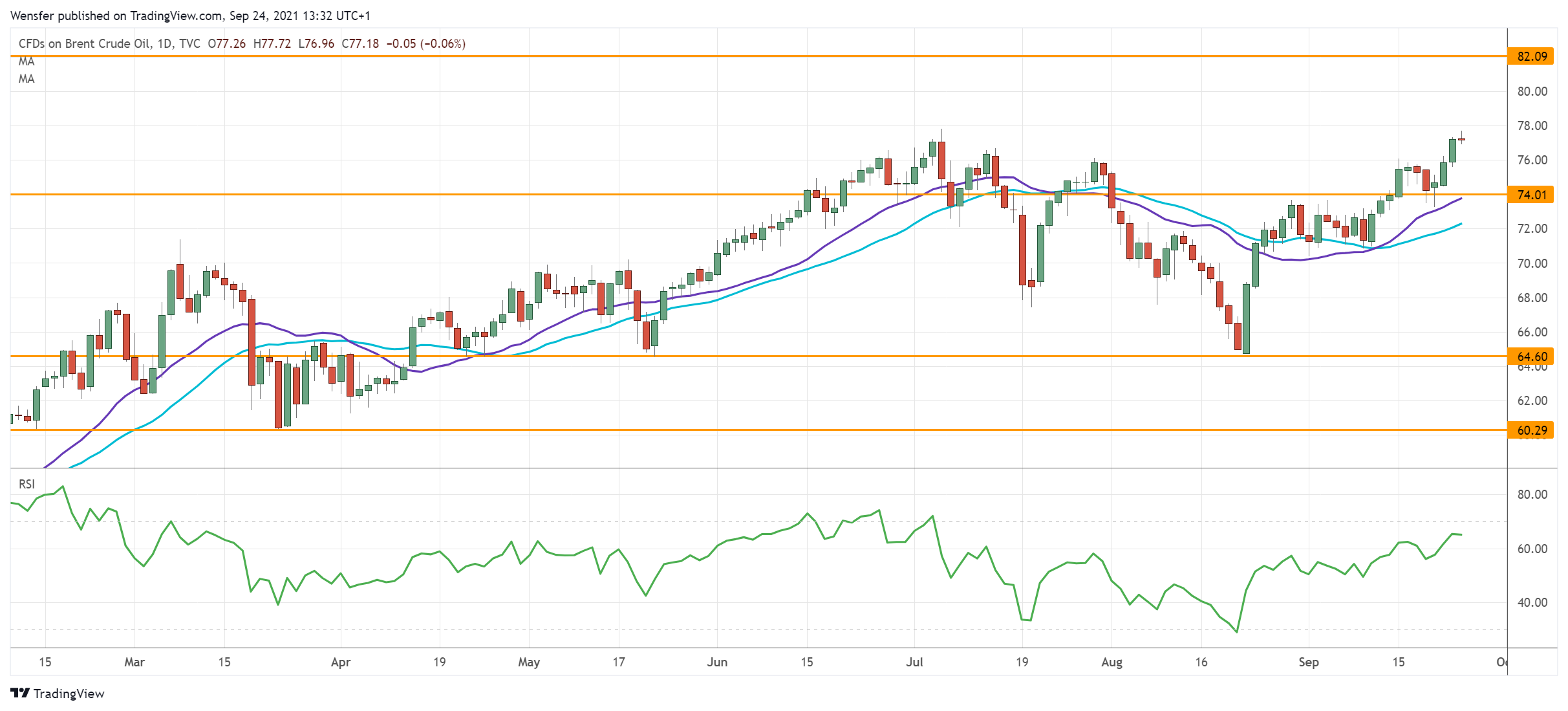 Brent crude hits a ten-week high amid supply constraints. The ongoing weekly drop in US stockpiles reflects disruptions in the Gulf Coast. US production remains paralyzed after the damage from Hurricane Ida, forcing refiners to draw on inventories.