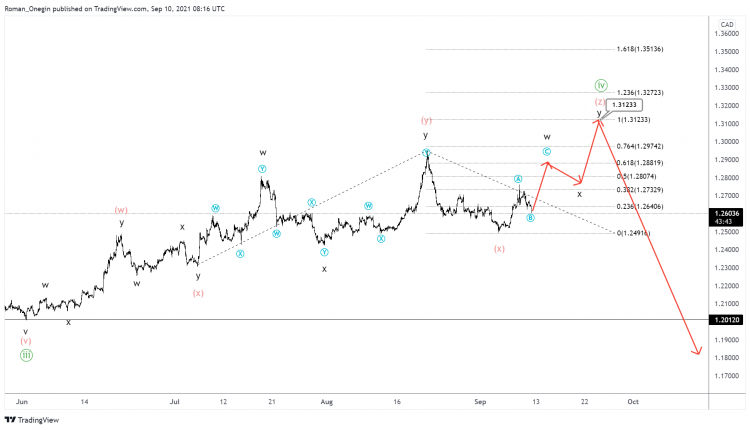 Price action on USDCAD hints at an upcoming bullish 5-wave impulse in correction wave w of a triple zigzag.