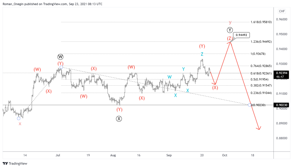 The formation of the USDCHF pair suggests the development of a cycle wave y, which hints at a double zigzag Ⓦ-Ⓧ-Ⓨ of the primary degree. Let’s pay attention to the last primary wave Ⓨ, which is under development.