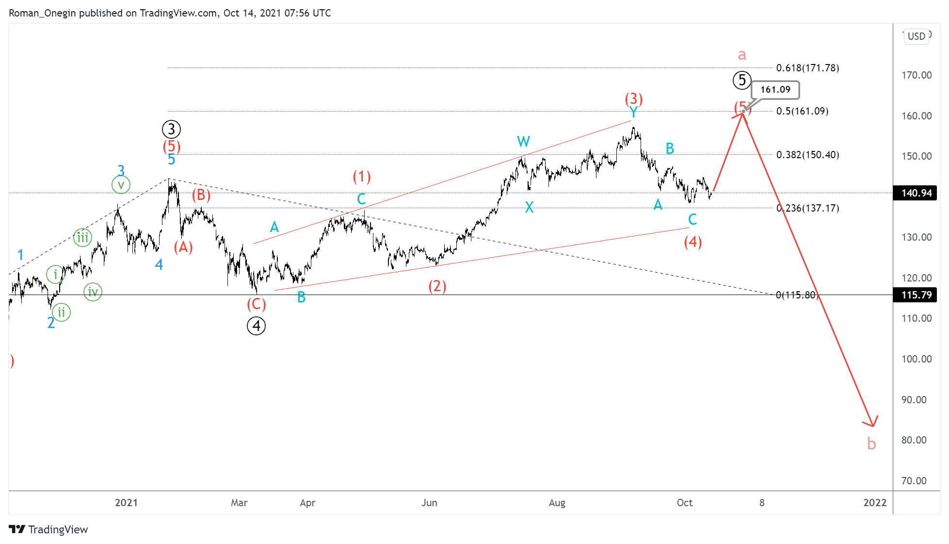 After the completion of the ending diagonal, prices could decline in the cycle correction b, below the level of 115.79.