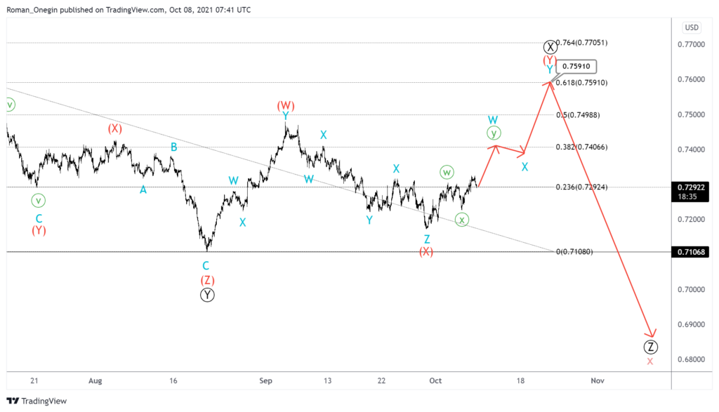 Perhaps at the level of 0.710 we saw the end of the primary wave Ⓨ, followed by the development of the primary intervening wave Ⓧ. Apparently, the wave Ⓧ takes the form of a bullish intermediate double zigzag (W)-(X)-(Y).
