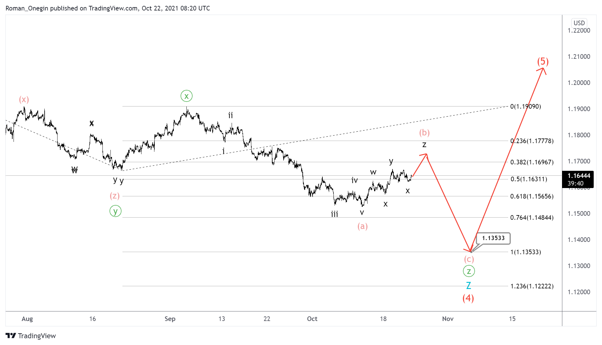 EURUSD eyes the development of a large bullish impulse. This impulse consists of intermediate sub-waves (1)-(2)-(3)-(4)-(5). Most likely, the construction of an intermediate correction (4) has recently ended. This has a complex internal structure of a triple zigzag W-X-Y-X-Z of the minor degree.