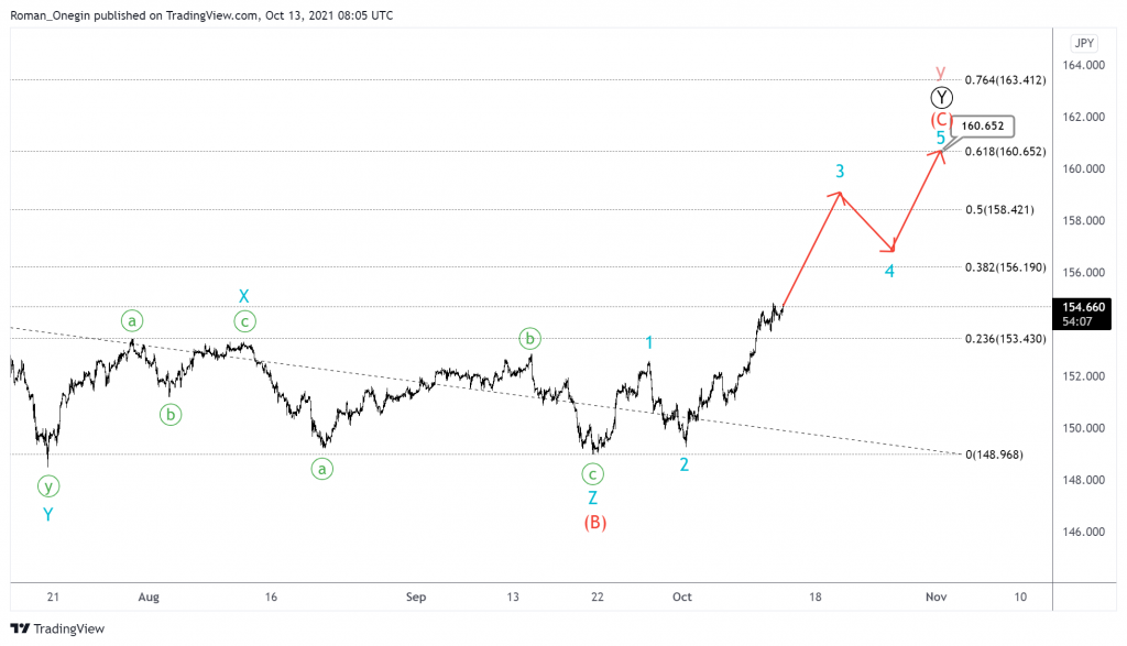 In the near future, we can expect an impulse price rise in the intermediate wave (C). This could take the form of a 1-2-3-4-5 impulse, as indicated on the chart, near 160.65.