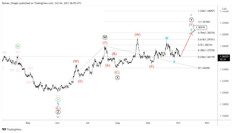 The formation of the USDCAD currency pair suggests the development of a large bearish double zigzag. Intervening wave x can take the form of a primary double zigzag Ⓦ-Ⓧ-Ⓨ.
