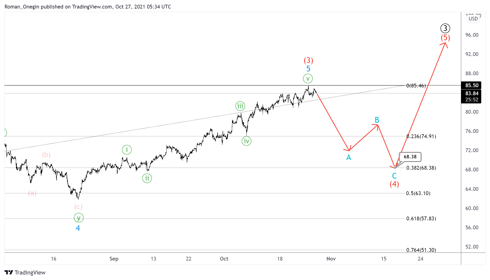 Thus, we expect a corrective decline in the minor zigzag A-B-C to 68.38 soon. At that level, wave (4) will be at 38.2% of impulse wave (3).