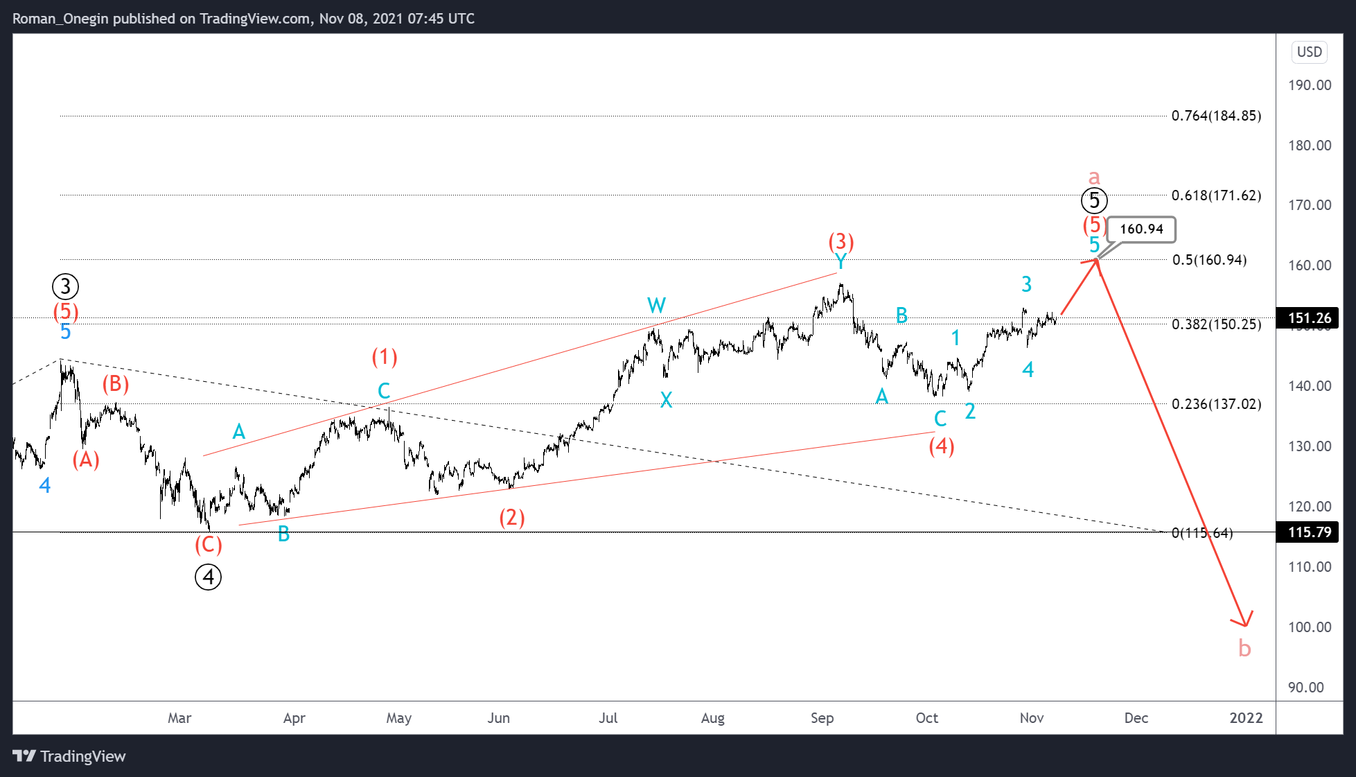 An alternative scenario shows the price moving higher in the final wave (5). This is likely to reach the level of 160.94, where wave ⑤ will be at 50% of primary wave ③.