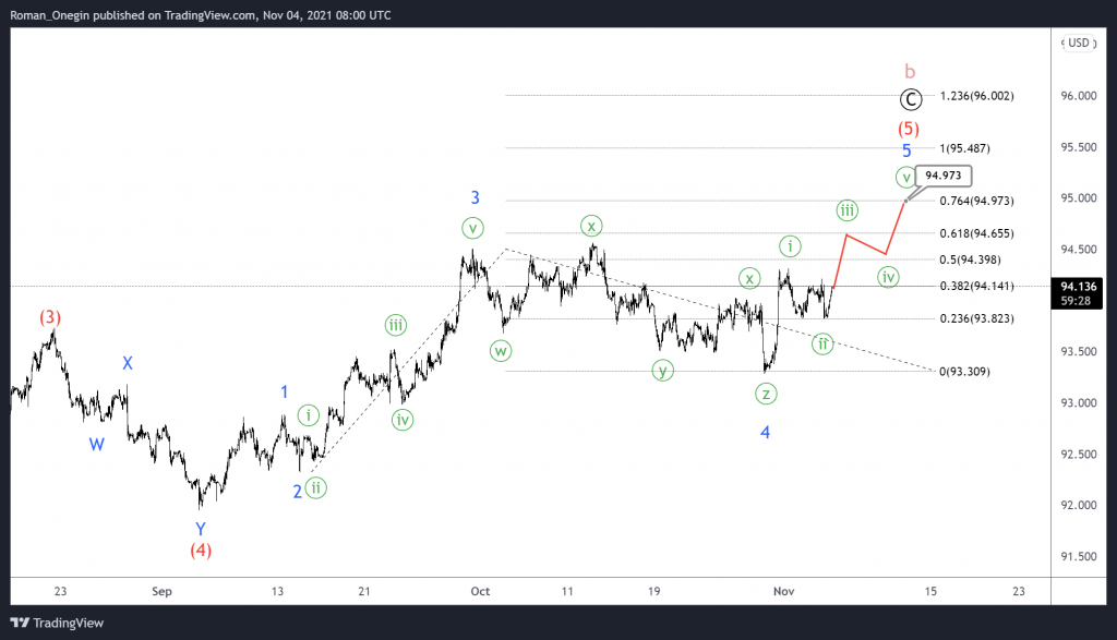 In the near future, we could expect an increase in the minute impulse, as shown on the chart. This can complete the minor fifth wave and with it the intermediate impulse (5) near 94.97.