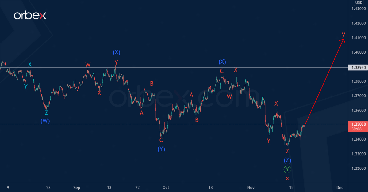 The formation of the GBPUSD currency pair suggests the development of a large double zigzag consisting of primary sub-waves Ⓦ-Ⓧ-Ⓨ.